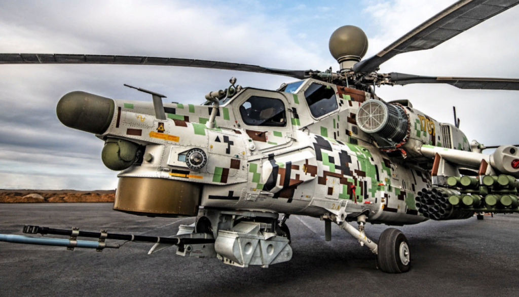 The helicopters seen in Iran carry a digital camouflage pattern and appear equipped with rotor blades associated with the Mi-28NM variant, along with an updated dust-protection system designed to improve performance in harsh environments.